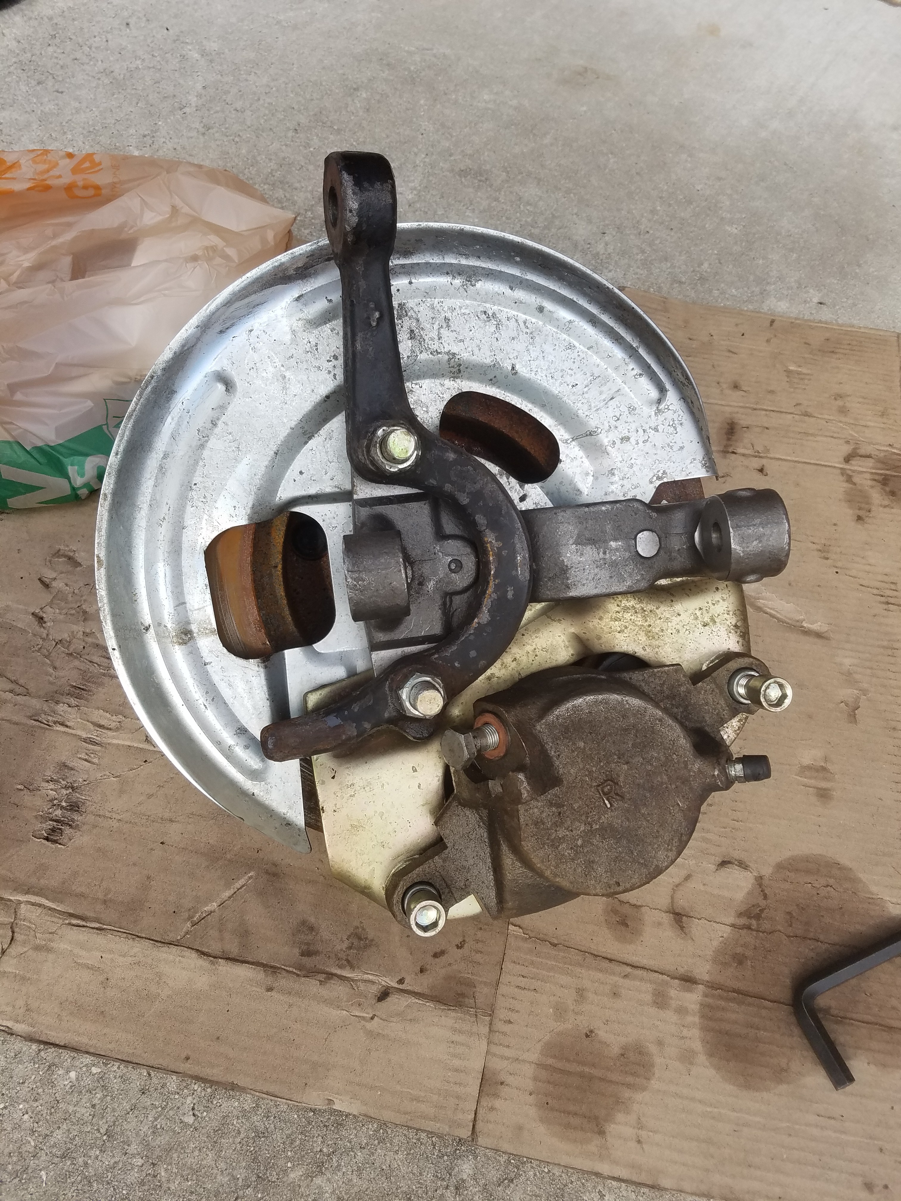 Pics of my unassembled “The Right Stuff” Disc brake conversion kit. As mentioned earlier, disassemble this prior to removing the original hub. All of this except the hub and bolts will be re-used.The gold bracket is what requires some grinding.